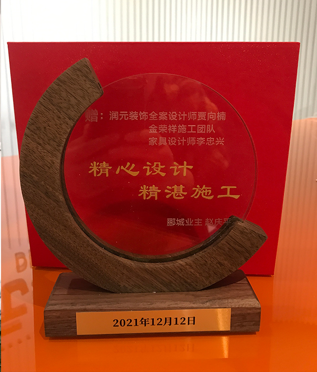 12月19日上午,酈城業(yè)主趙慶平夫婦來到潤元裝飾,將一座“精心設計 精湛施工”的水晶獎杯送到設計師賈向楠以及工長金榮祥手上,以表達對潤元設計師,施工團隊以及家具設計師工作的認可和感謝,潤元一定會以更優(yōu)質(zhì)的服務回饋到業(yè)主。