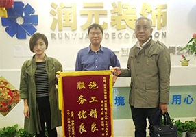 2016.7.16日上午,潤(rùn)元裝飾客戶(hù)柏樹(shù)啟攜家人來(lái)到潤(rùn)元裝飾總公司,將一面繡有“設(shè)計(jì)滿(mǎn)意 服務(wù)到位 手藝精湛盡心盡責(zé)”的牌匾送到潤(rùn)元裝飾的領(lǐng)導(dǎo)手中,衷心感謝潤(rùn)元裝