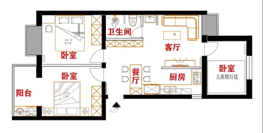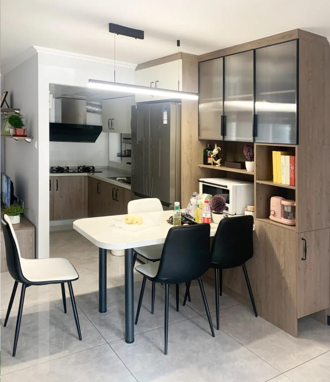2、增加用餐空間房子的原業(yè)主在家吃飯,基本沒有固定的用餐區(qū),吃飯的時(shí)候直接擺放一張小餐桌來使用,如今何女士急需一個(gè)能夠滿足未來五口人使用的餐區(qū)。