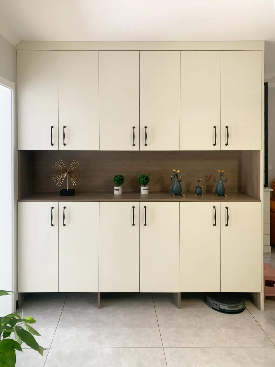 設(shè)計(jì)師封堵了正對著入戶門的衛(wèi)生間門洞,將新的門洞開在了朝向客廳的那面墻,解決了門廳門洞多的問題,同時(shí)在此區(qū)域打造了一組通頂鞋帽柜,分區(qū)儲藏,讓整個(gè)門廳實(shí)用、美觀、明亮。