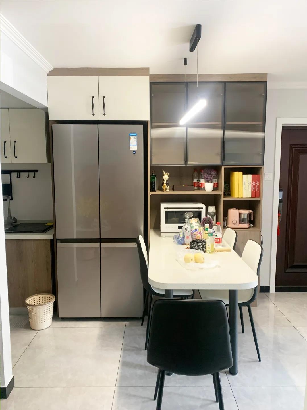 設(shè)計(jì)師拆掉了廚房與客廳間的部分墻體,同時(shí)也拆掉了廚房與門廳間的整面墻體,在此區(qū)域?yàn)楹闻恳患掖蛟炝瞬蛥^(qū),融合門廳空間,整個(gè)區(qū)域有12平米,通頂餐邊柜,滿足平時(shí)儲物需求,四開門冰箱也從廚房外移到這個(gè)位置,整個(gè)空間實(shí)用美觀。