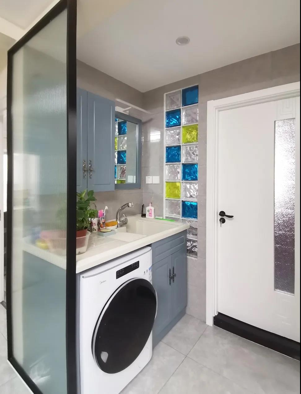 設(shè)計(jì)師將洗手盆和洗衣機(jī)外移,將此處2平米的空間規(guī)劃為衛(wèi)生間的干區(qū),利用定制家具打造了一組浴室柜,合理利用空間的同時(shí)也增加了儲(chǔ)物。