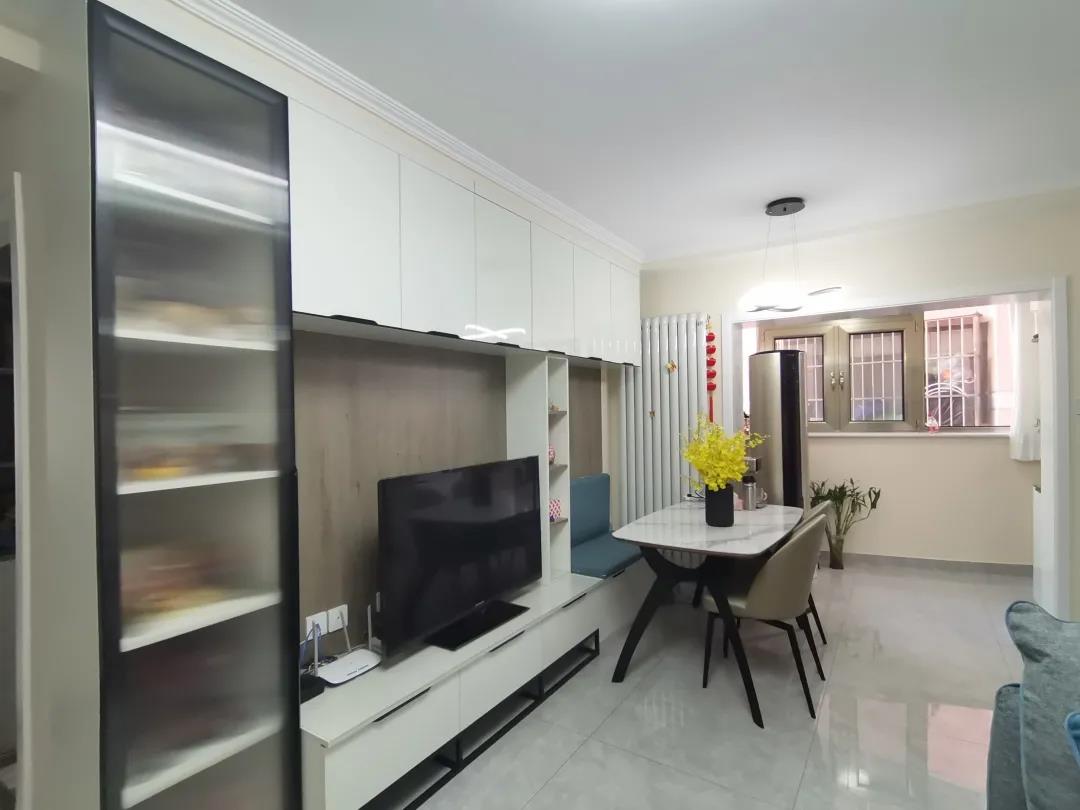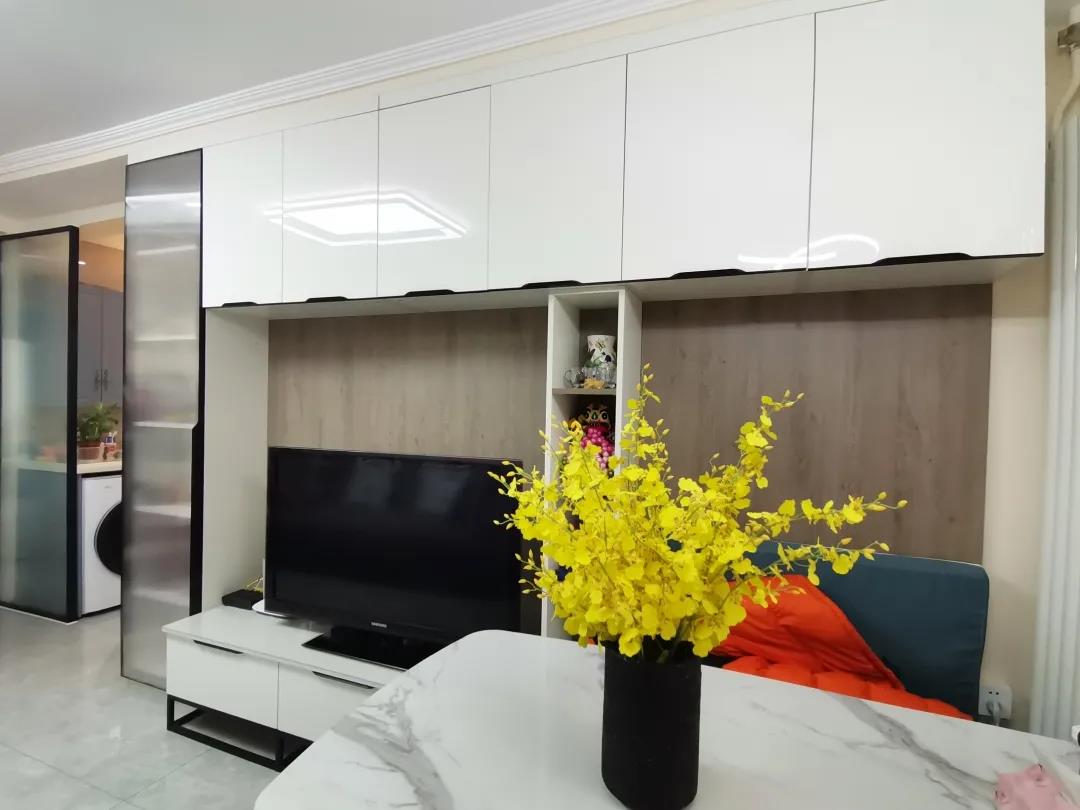 設(shè)計(jì)師拆掉了不承重的門聯(lián)窗,將陽臺(tái)納入客廳,客廳面積由17平米擴(kuò)大到了22平米,將此處打造為餐客一體的空間。利用定制家具打造的一體的電視餐邊柜,用餐娛樂更方便,保障空間開闊性的同時(shí),最大限度的增加了儲(chǔ)物空間。