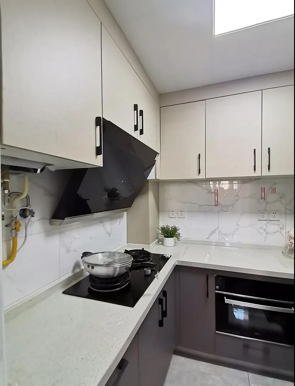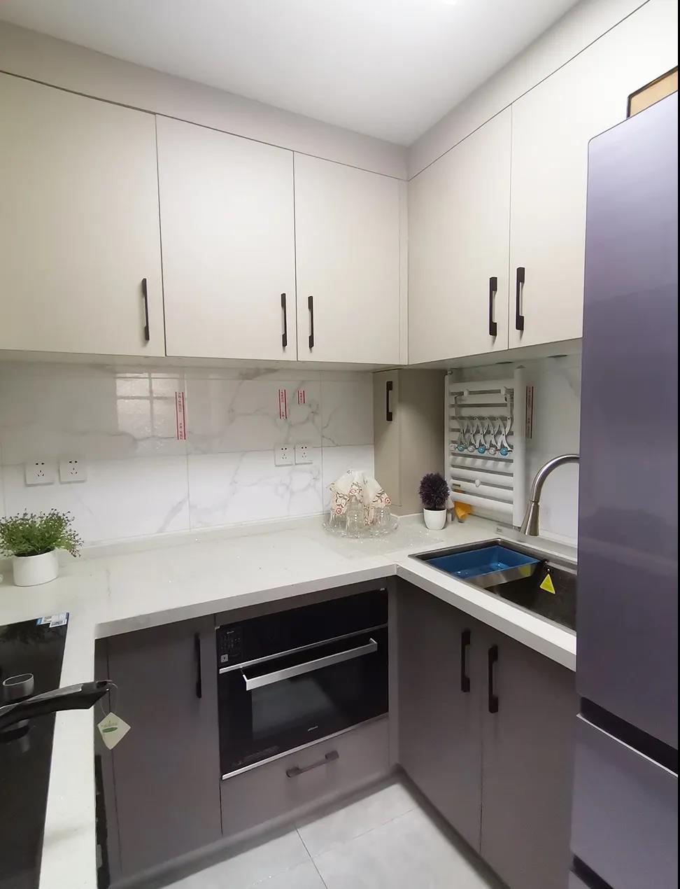 設(shè)計(jì)師將原廚房的門洞進(jìn)行了封堵,開在了朝向陽臺(tái)的方向,利用定制家具打造了一組u字形櫥柜,儲(chǔ)物空間充足,動(dòng)線合理,光線明亮。冰箱也順利入住,常用的小家電也都能擺放進(jìn)來,方便好用。