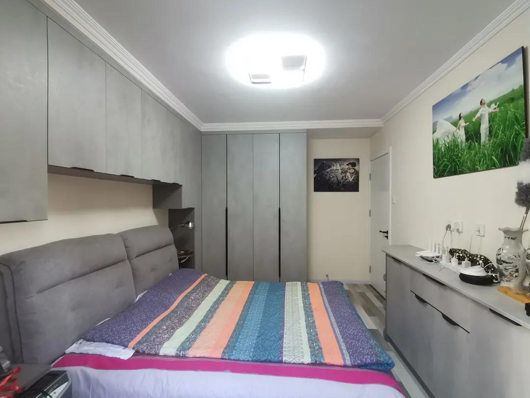設(shè)計(jì)師將主次臥聯(lián)通的陽臺(tái)一分為二,分別匹配給了兩間臥室,主臥是兒子兒媳的臥室,在這里利用定制家具打造了一組通頂衣柜,床頭柜,矮柜實(shí)現(xiàn)了主臥休息儲(chǔ)物的功能。