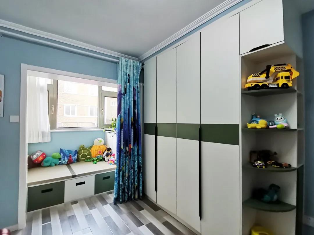 設(shè)計(jì)師拆掉了原有陽臺(tái)的輕體墻,將這個(gè)空間從12平米擴(kuò)大到16平米,利用定制家具,在兒童房同樣實(shí)現(xiàn)了大容量儲(chǔ)物,榻榻米、五斗柜,還有為兩個(gè)孩子打造的衣柜,房間整體打造成夢(mèng)幻海洋主題,美觀且實(shí)用。