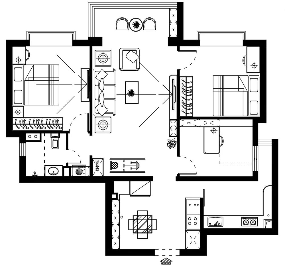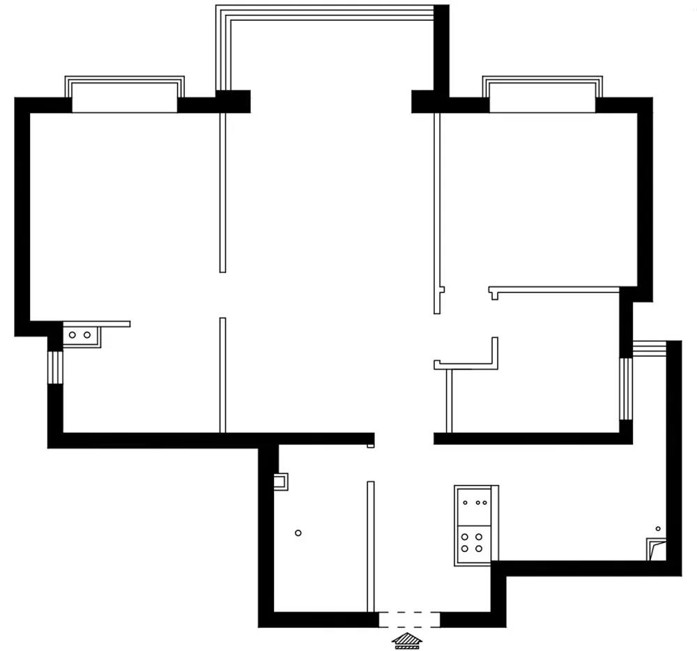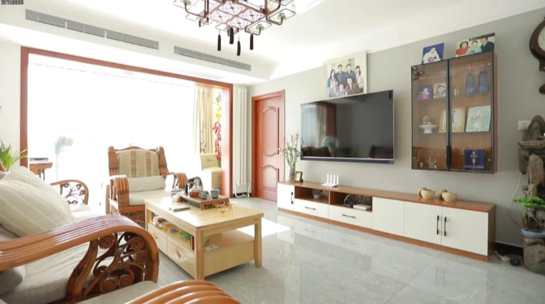 客廳面積25平米,設(shè)計(jì)師封堵了原來次臥室的門,重新選擇了門的位置,調(diào)換了沙發(fā)和電視柜的位置,使電視背景墻兩邊對(duì)稱。同時(shí)將主臥與客廳間的墻體延長(zhǎng)了1.2米。