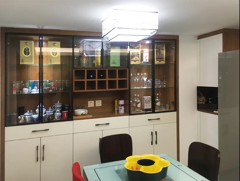 而打通后的這部分空間設(shè)計(jì)師規(guī)劃為了用餐,儲(chǔ)物空間。一組定制展示柜實(shí)現(xiàn)了大容量?jī)?chǔ)物的同時(shí),也使整個(gè)空間看起來更加整潔。