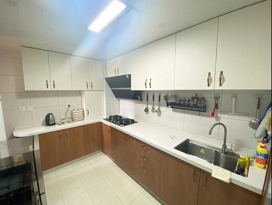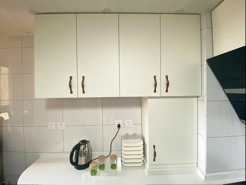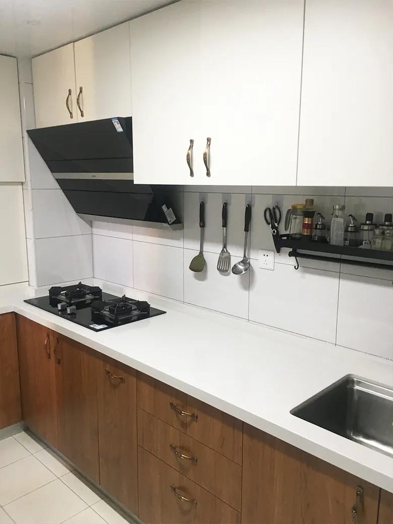 設(shè)計(jì)師李世昌將冰箱外移,設(shè)置一組L型櫥柜,洗切炒動(dòng)線合理,整體寬敞明亮,使用方便的同時(shí)也增加了廚房?jī)?chǔ)物。