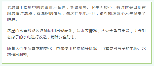老房改造當(dāng)中有兩種水電改造的方式:一種是全改,一種是斷點改造。如果上次裝修不超過三到五年,并且水電全部重新?lián)Q線,那再裝修,您可以選擇斷點改造。如果時間再久,從安全角度考慮,那就建議全部重新?lián)Q線。