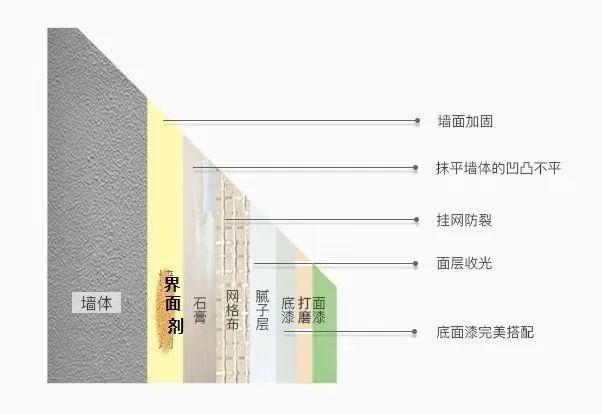 首先是鏟墻皮,然后基層水泥找平,接下來是刷界面劑,刷界面劑能夠有效的除去灰塵,讓石膏層和墻面有效的進行粘合。再往下是石膏找平,石膏找平目前是分兩種,一種是垂平,另一種是順平。再往下是我們輕體墻貼布,貼布是有效的做一個拉伸,防止墻面開裂。