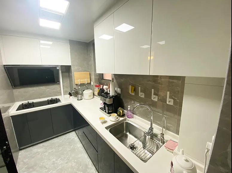 設計師改動了廚房的墻體后,櫥柜可以做成L形的,提高了利用率。并且這面墻向門廳移動了8厘米,操作空間也變寬敞了。洗切炒動線合理,儲物充足,小家電也有了更多的擺放位置。