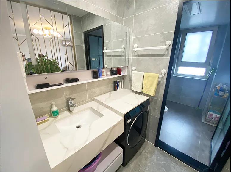 干區(qū)實現(xiàn)洗衣、洗漱雙重功能,定制浴室柜使墻面、臺面、臺下都得到了充分的利用,增加了儲物空間。將原有到頂?shù)倪@面墻體進行了拆除,改為半高矮墻,利用金屬窗進行了鏤空處理,整個空間采光充足、視野開闊、動線合理。