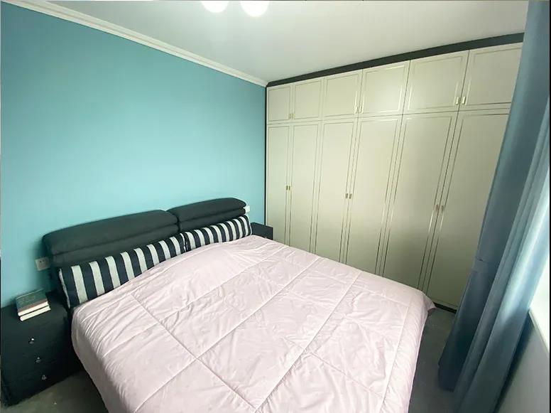 設計師利用定制家具沿著這面墻體,為李女士孩子的婚房打造了一組通頂衣柜,保溫的同時,儲物充足、既美觀又實用,雙人床擺放在這里,也不影響平時的正常出入。
