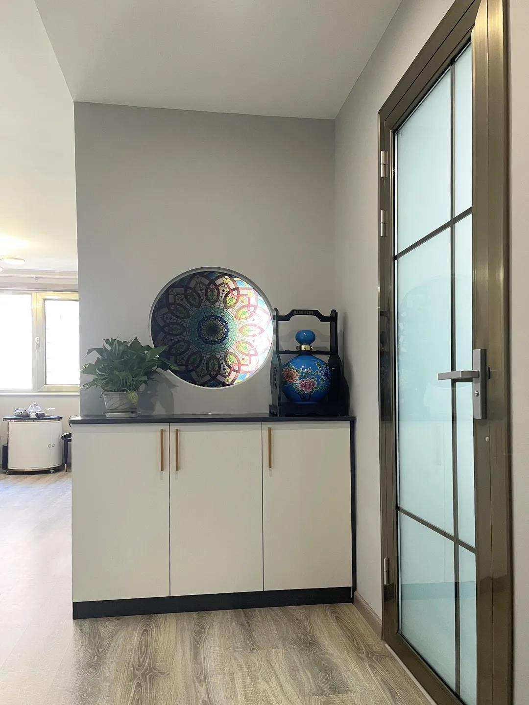 為了能夠?qū)崿F(xiàn)獨(dú)立、完整、好用的玄關(guān),設(shè)計(jì)師在進(jìn)門的左手邊新建了隔斷墻,封堵了原來正對(duì)入戶門的主臥室門,并且將這面墻向衛(wèi)生間與入戶門方向移動(dòng)了70厘米。調(diào)整了幾面墻體后,就有了一個(gè)4.7平米的門廳。這樣,有了門廳的儲(chǔ)物,有了養(yǎng)眼的玄關(guān)。而且讓整個(gè)居室空間隱私性更強(qiáng)。