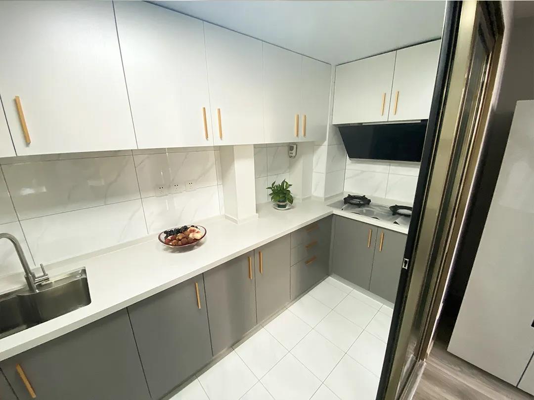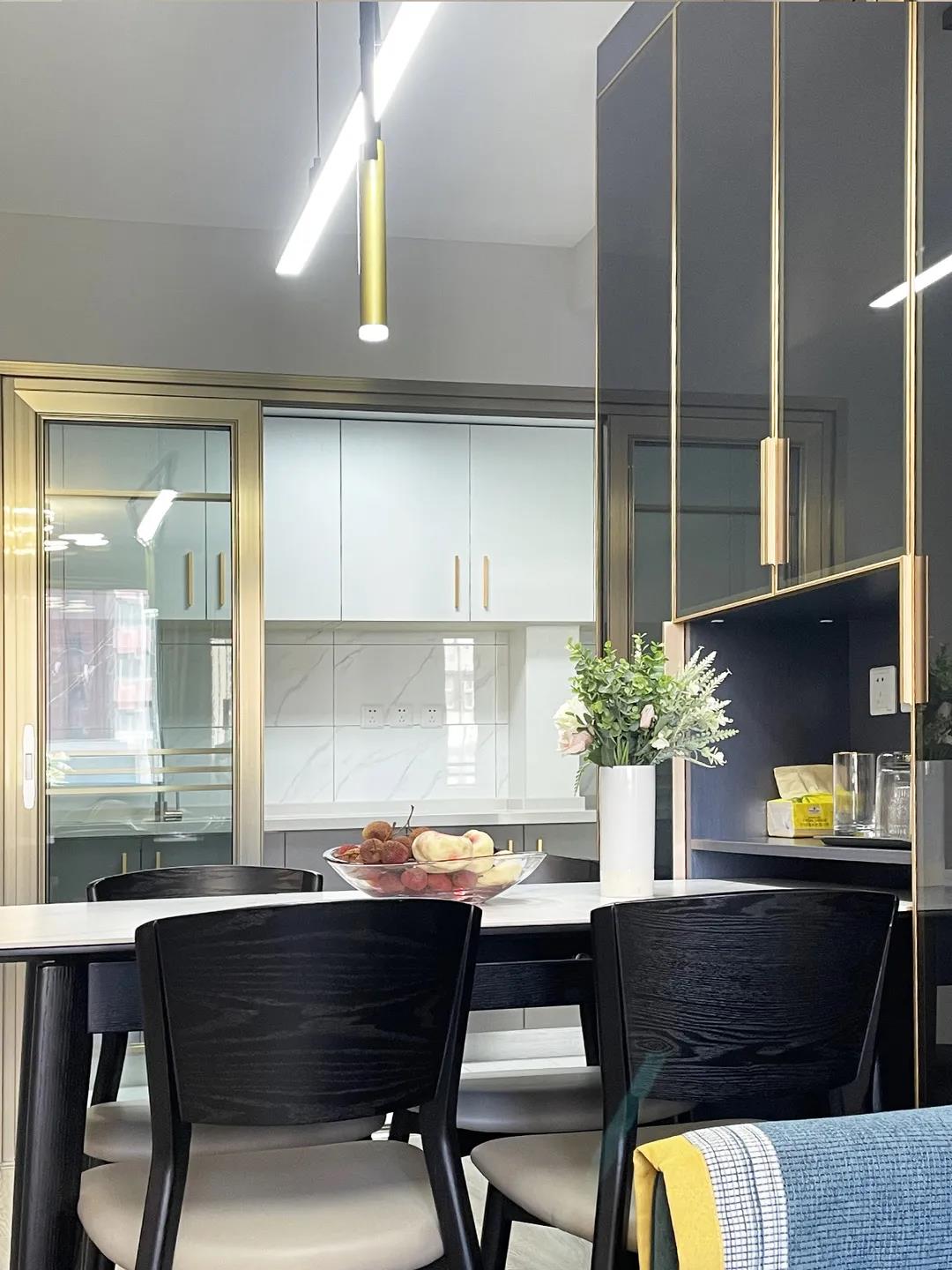 設(shè)計(jì)師將原有的廚房空間變換了位置, U字形櫥柜的設(shè)計(jì),滿足大容量儲(chǔ)物的同時(shí),還增加了不少造作空間。鋁合金玻璃推拉門的設(shè)計(jì),讓廚房可封閉可開放,可以根據(jù)不同的場景需求來改變。原有的廚房陽臺(tái)打造成了晾曬區(qū),解決了業(yè)主未來的晾衣問題。