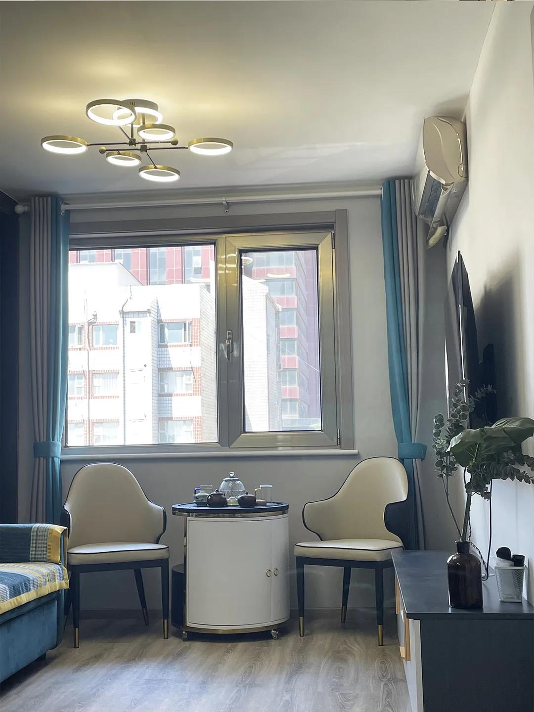 設(shè)計(jì)師將客臥的一面墻體進(jìn)行拆除,把這部分區(qū)域規(guī)劃到客廳空間,在這里打造了餐區(qū)。通頂餐邊柜方便收納,又能起到展示作用。沙發(fā)和電視柜也終于能正對(duì)擺放,而且在這里還為謝先生打造了休閑區(qū),與朋友品茶聊天,十分愜意。旁邊還打造了一組通頂儲(chǔ)物柜,來補(bǔ)充客廳的儲(chǔ)物,整體空間美觀、實(shí)用。