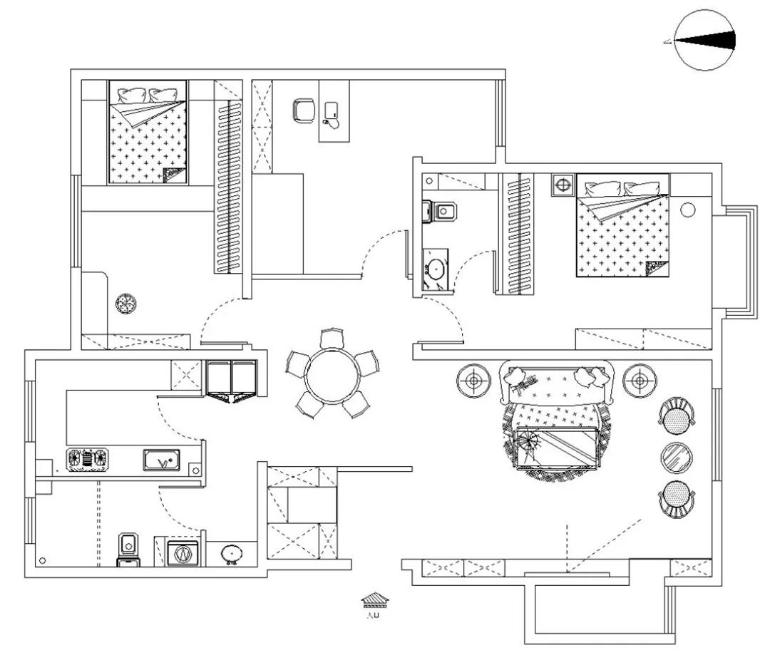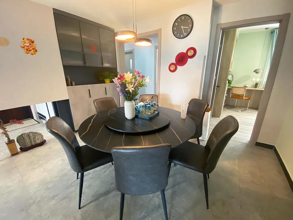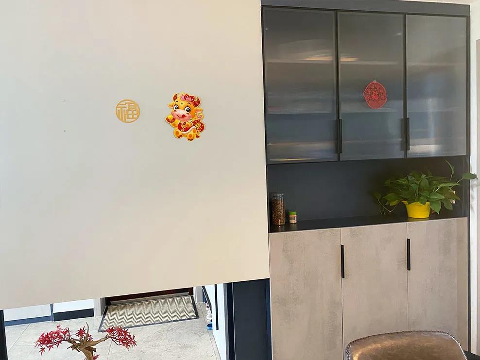 設(shè)計(jì)師將原有過(guò)道區(qū)域的墻體拆除,將餐區(qū)設(shè)計(jì)在這里,利用玄關(guān)處的回字型衣帽間的這組儲(chǔ)物柜,進(jìn)行了雙面儲(chǔ)物的設(shè)計(jì),靠近餐區(qū)的柜子打造成通頂餐邊柜,美觀、實(shí)用、還節(jié)省了不少空間。