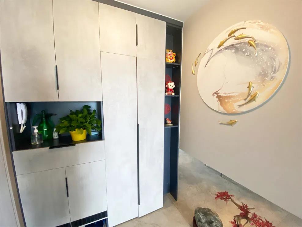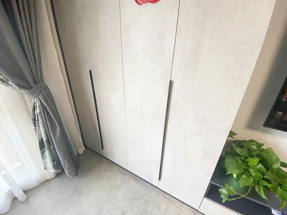 為了能夠?qū)崿F(xiàn)獨(dú)立、完整的玄關(guān)區(qū)域,設(shè)計(jì)師在距離入戶門1.7米的位置,新建了一道長(zhǎng)1.4米的玄關(guān)墻,再利用定制家具在這里打造了一組回字形的隱藏式衣帽間。