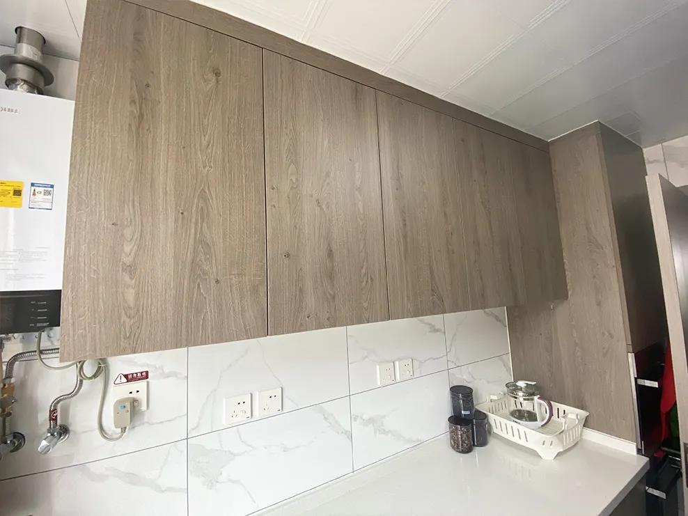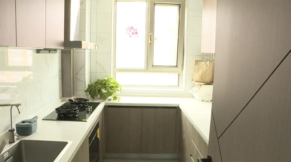 借用原有過(guò)道區(qū)域部分空間,將廚房門洞進(jìn)行挪動(dòng),新建了兩面70厘米的墻體,冰箱嵌入其中。廚房里,U字形櫥柜的設(shè)計(jì),滿足大容量?jī)?chǔ)物的同時(shí),還增加了不少操作空間,通頂電器柜,擺放各種小家電,儲(chǔ)物強(qiáng)大,操作便捷。