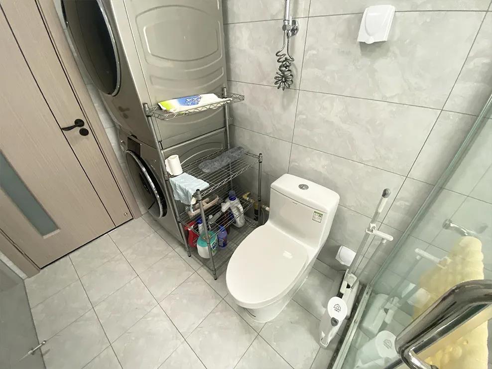 設(shè)計(jì)師新建了一道墻體,進(jìn)行區(qū)域劃分,外面作為衛(wèi)生間干區(qū),用來(lái)滿足日常洗漱功能。里面則規(guī)劃了淋浴區(qū)、如廁區(qū)和洗衣區(qū)。