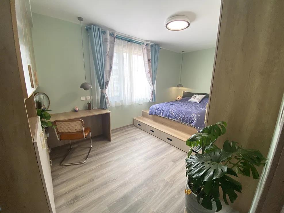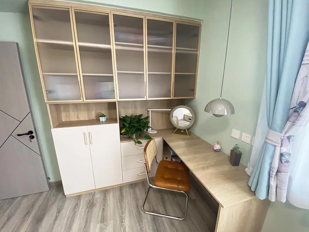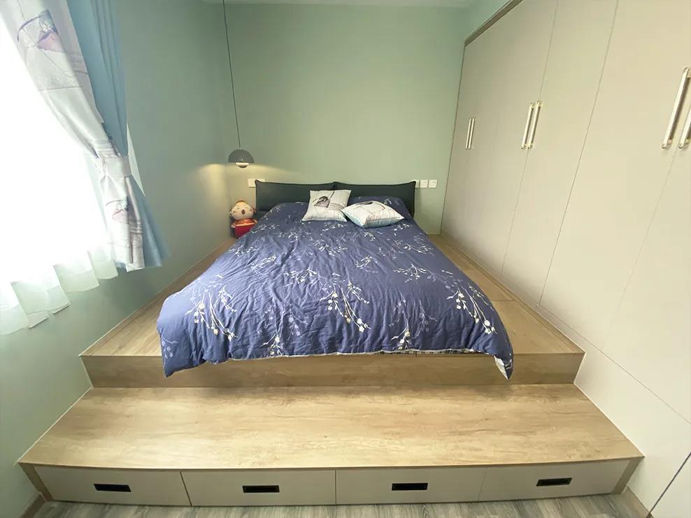 地臺(tái)以及通頂儲(chǔ)物柜的設(shè)計(jì),充分利用空間的同時(shí)增加了臥室儲(chǔ)物,利用定制家具打造的書柜及書桌的組合,學(xué)習(xí)、辦公、儲(chǔ)物、展示都可以滿足。