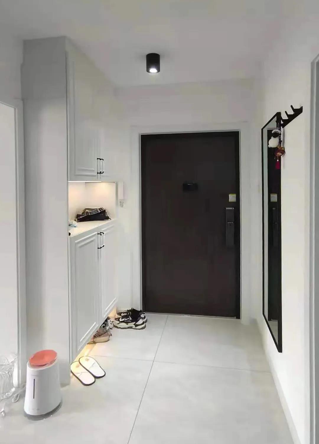 門廳——設(shè)計師封堵了原次臥門洞,再將客廳埡口延長了48厘米,在這里打造了一組通頂鞋帽柜,既增加了門廳儲物也方便進出隨手放置衣物。封堵后的墻體則放置了穿衣鏡,頂面利用筒燈進行照明,整體空間明亮實用。