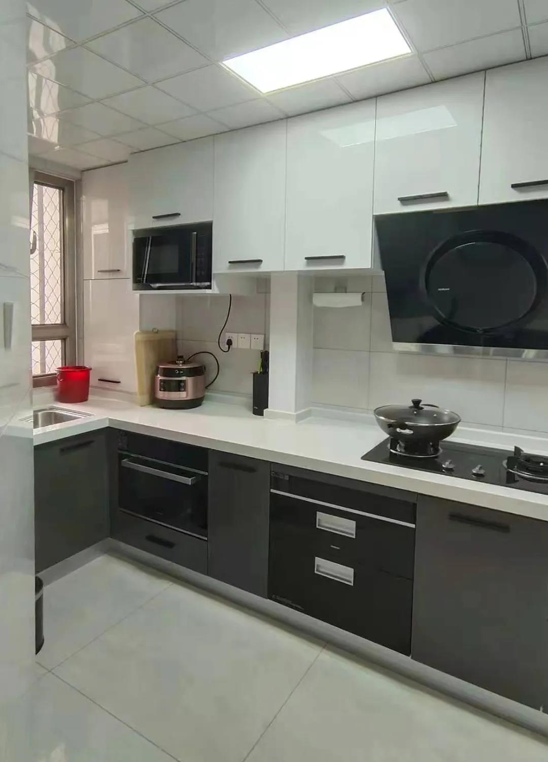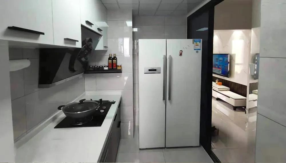 廚房——原廚房T字型墻體改為斜切角,門洞外推,廚房由原來的單門變成雙門,面積由4.6平米擴容到了5.3平米。一臺雙開門冰箱,一組超長臺面L型櫥柜,動線合理,儲物充足,操作空間大大提升。