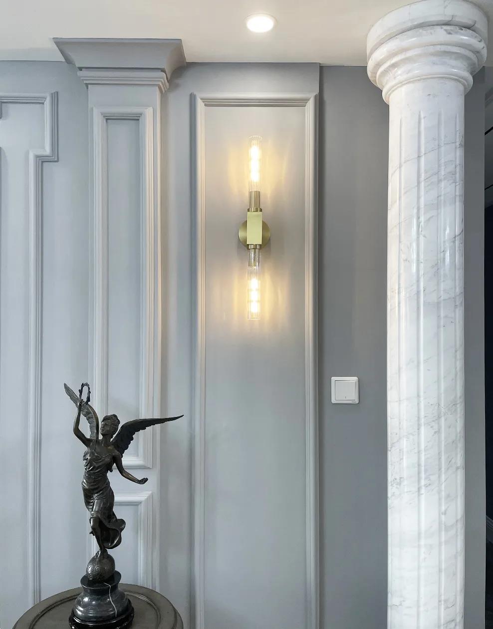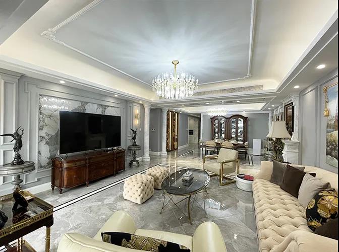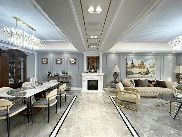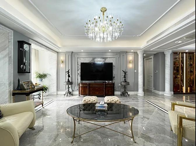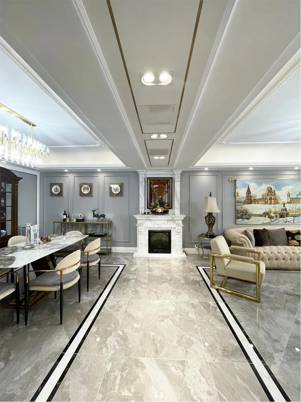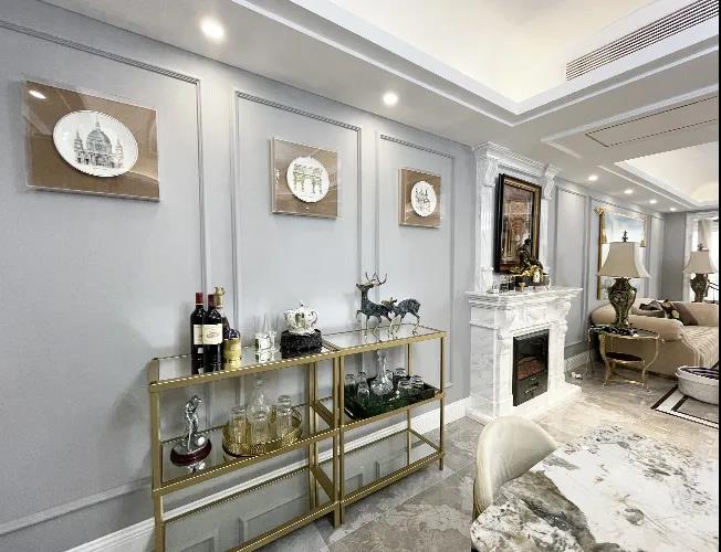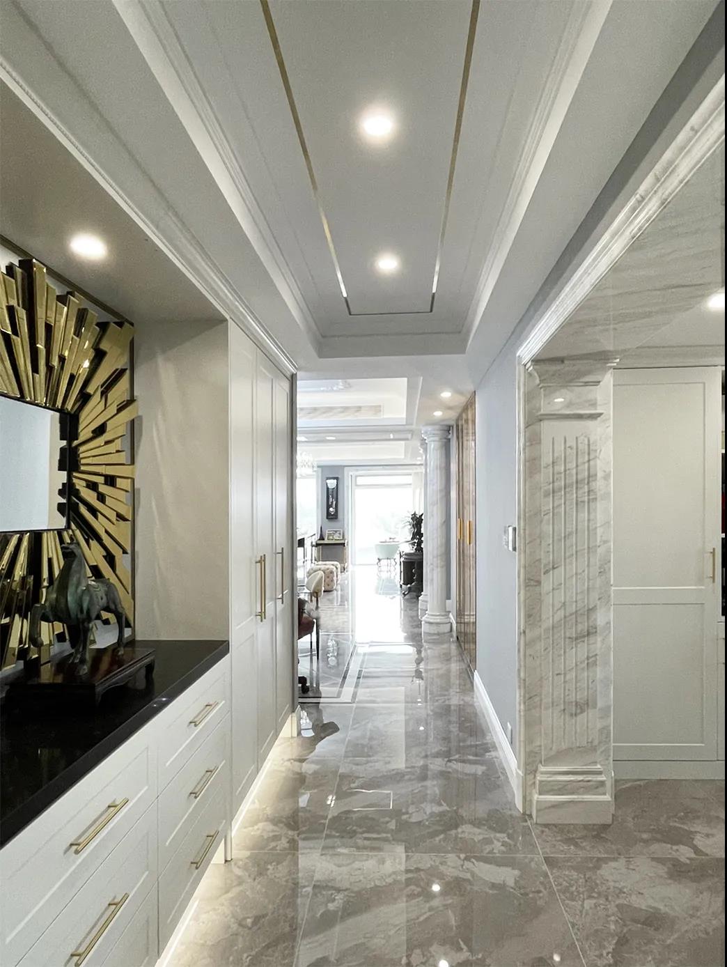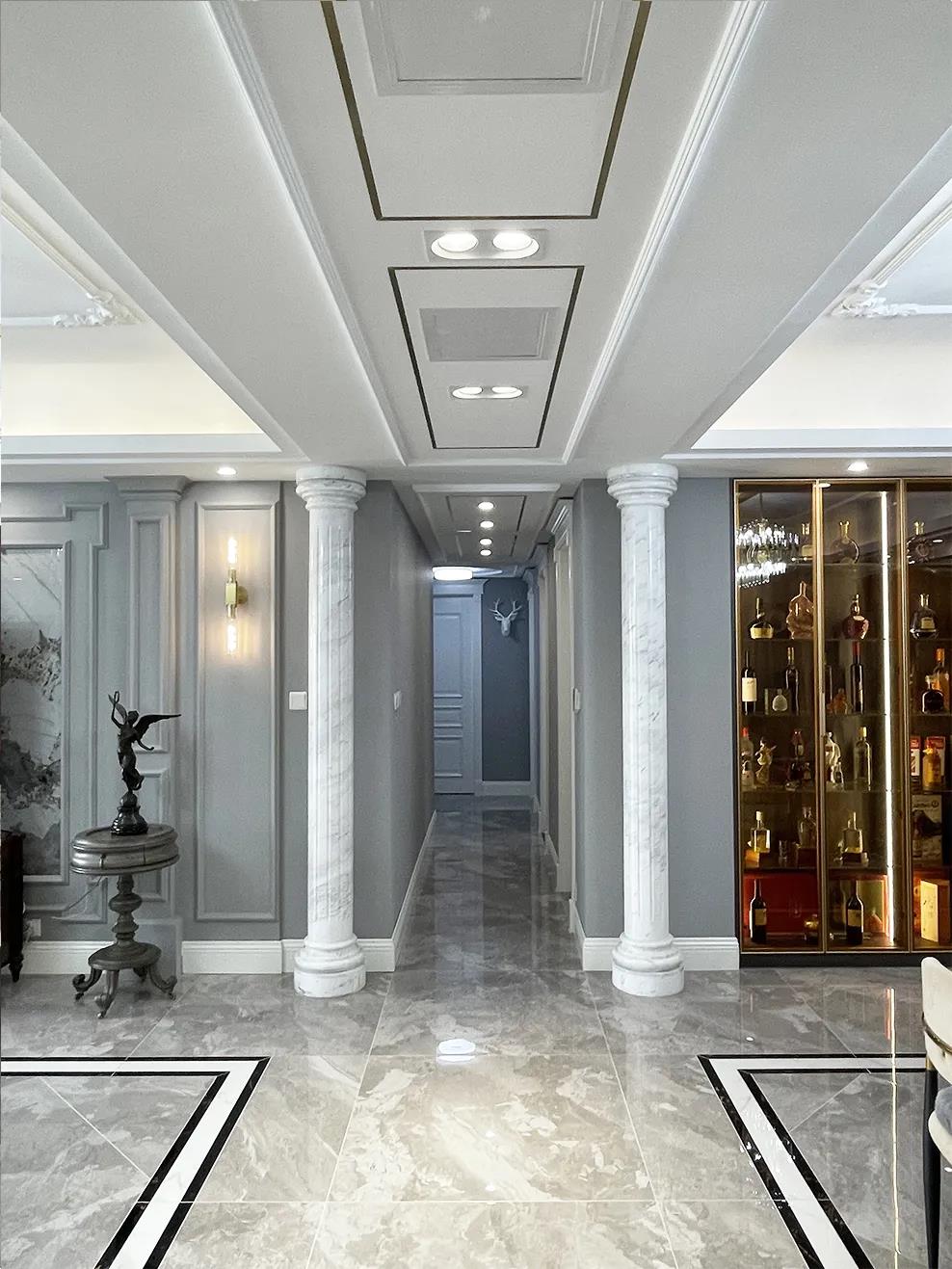 過道空間,設計師利用壁爐,羅馬柱以及吊頂?shù)脑O計,將整個空間的功能區(qū)劃分開來,同時又加了室內(nèi)的設計感和氛圍感。