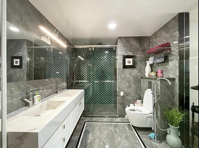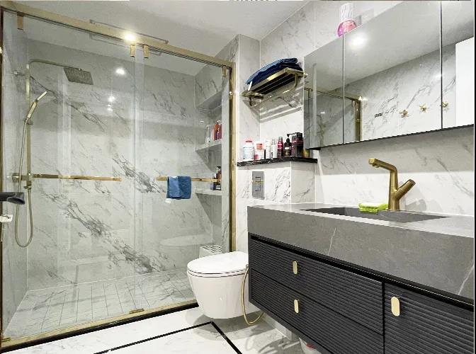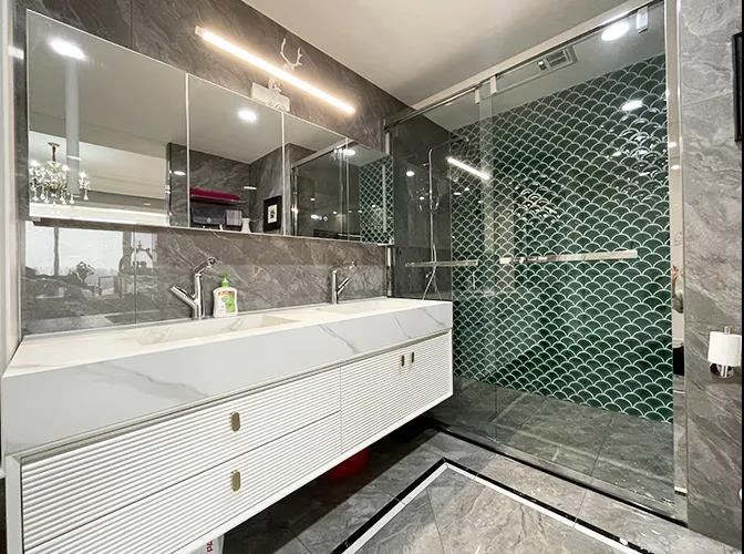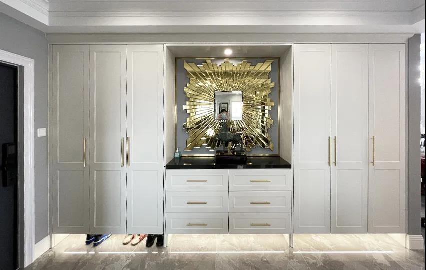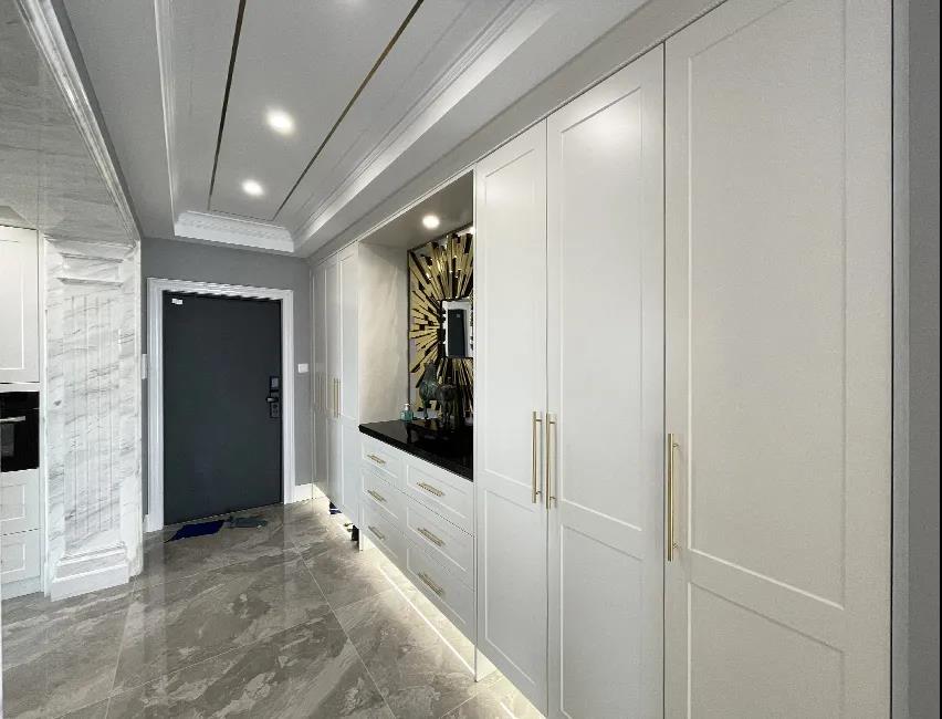 門廳設置了一組輕奢定制鞋帽柜,并且進行了收納劃分,左邊是放鞋區(qū)和掛衣區(qū),中間部分設計了玄關鏡和分類收納區(qū),右側(cè)同樣是掛衣區(qū)。吊頂利用暗藏式筒燈的設計提升空了間亮度,美觀好用。