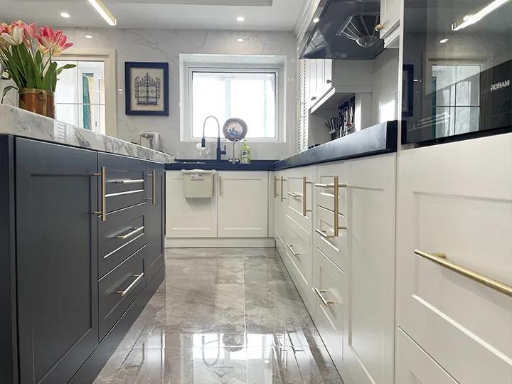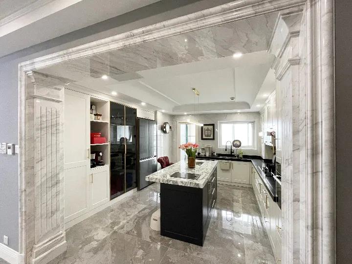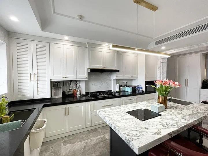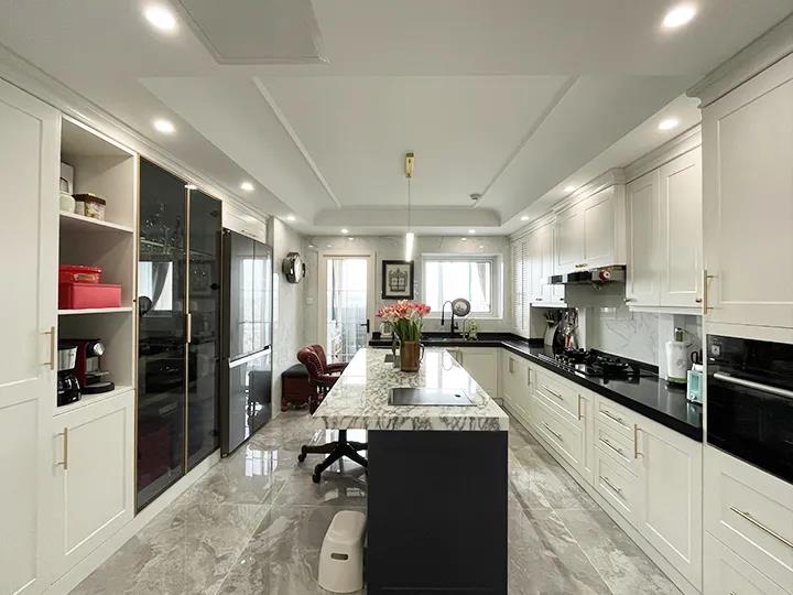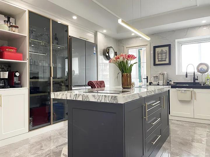 設計師打破傳統(tǒng)的廚房形式,利用潤元的定制櫥柜,融入多種元素、多種風格,為陳女士打造了一個專屬于她的廚房空間。中央島臺的設計,既有便捷的隱藏式水盆,還有暗藏式的微波爐。島臺底部,一邊作為儲物收納,另一邊為了讓業(yè)主坐著更加舒適,進行了內(nèi)凹造型設計。