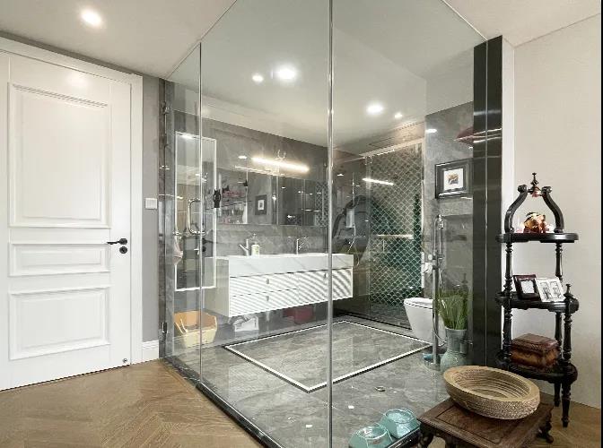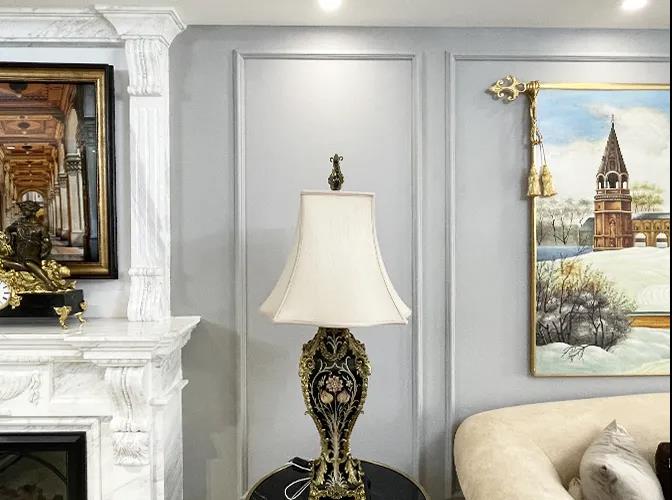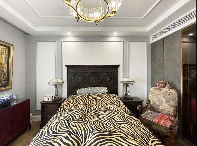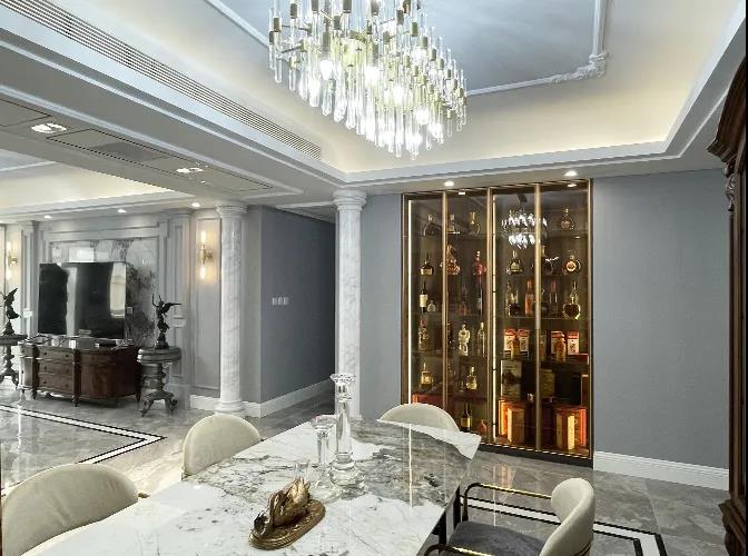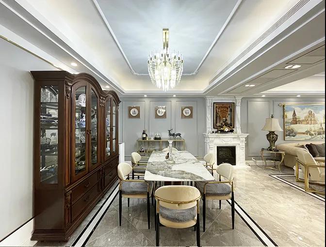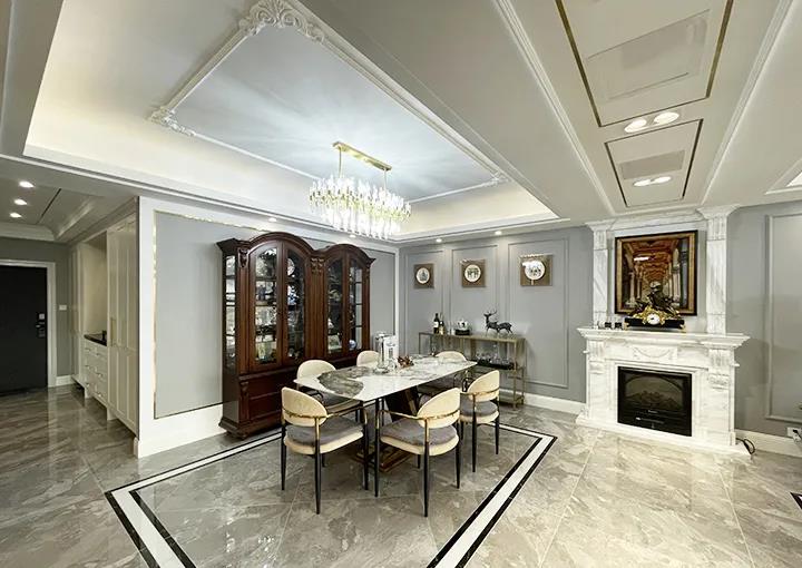 餐廳空間,業(yè)主保留了原來的美式柜子,設計師將法式元素融入吊頂,美式元素融入墻面,搭配輕奢質(zhì)感的餐桌椅,使整體空間和諧溫馨。一組定制的餐邊柜,既可以儲物又可以展示,同時還使整個空間更加靈動活潑。