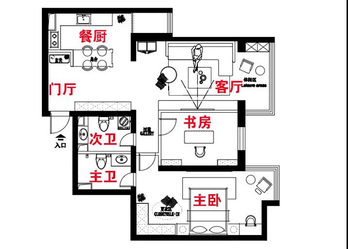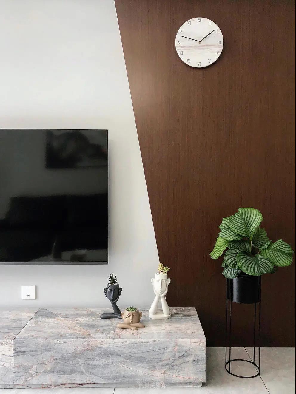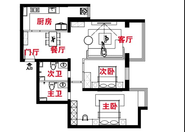 設(shè)計(jì)師對(duì)調(diào)了沙發(fā)和電視背景墻的位置,使處在客廳空間的主人更具有安全感。同時(shí)也使餐廚,客廳,客廳陽臺(tái),這條動(dòng)線更加合理,空間更加寬敞通透。