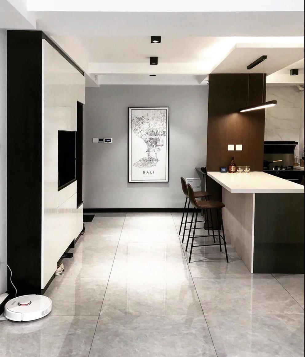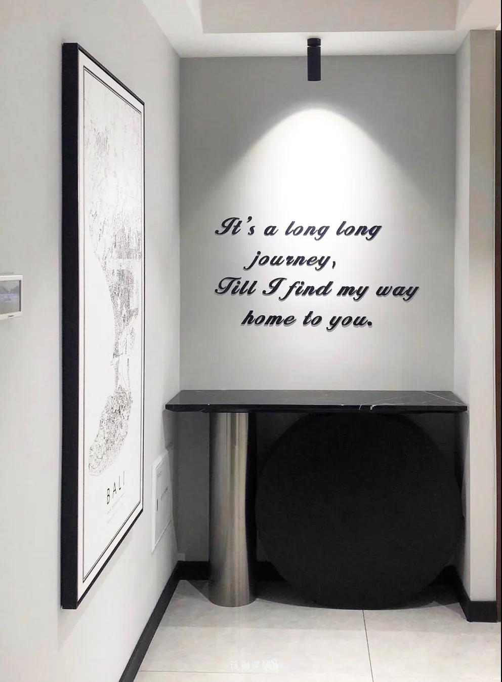 為了解決入戶空間存在的問題,設(shè)計(jì)師拆除了原來正對(duì)著門的廚房的一面墻體,重新規(guī)劃了一面L型墻體,為這一百多平米的房子規(guī)劃了一個(gè)富有儀式感的玄關(guān)。整體黑白灰色調(diào)的搭配,讓業(yè)主打開門的瞬間,便會(huì)產(chǎn)生一種摒棄外界的喧鬧與繁華,回歸家庭的安靜與純粹。富有設(shè)計(jì)感的玄關(guān)柜,為門廳增加了一分時(shí)尚,墻面上巴厘島掛畫不僅遮蓋住了強(qiáng)電箱,也是對(duì)小兩口結(jié)婚地的紀(jì)念。將業(yè)主喜歡的歌星的一句歌詞,結(jié)合頂面的射燈,讓門廳空間更富有氛圍感。