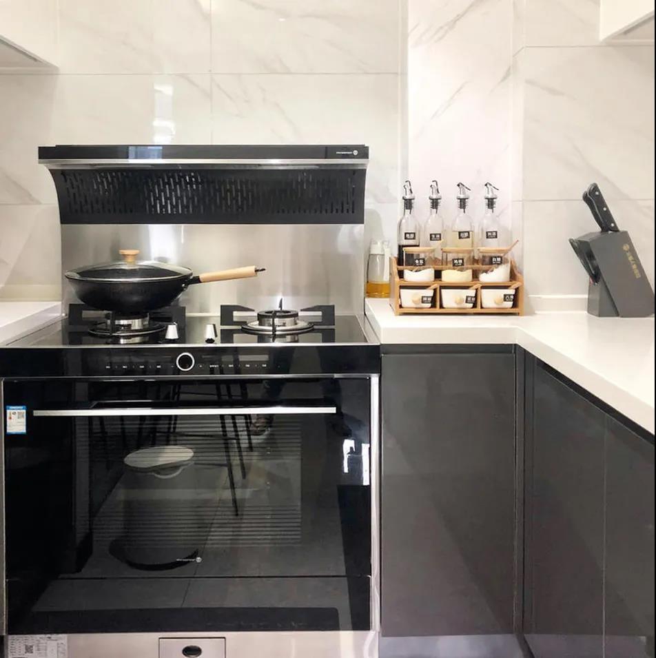設(shè)計(jì)師將封閉式廚房改為開放式,餐廚一體的空間布局,更符合小兩口之前在國外生活的習(xí)慣,整體空間也更加時(shí)尚,開闊明亮。挪走了冰箱,重新規(guī)劃了操作動(dòng)線,使用起來更加方便。沿L型墻體,吧臺(tái)與餐桌的融合,用餐、辦公、休閑都是可以的。吊柜與地柜,以及吧臺(tái)下面的柜子也為廚房提供了充足的收納空間。整體空間,上淺下深的顏色搭配,使廚房富有層次感和空間感。