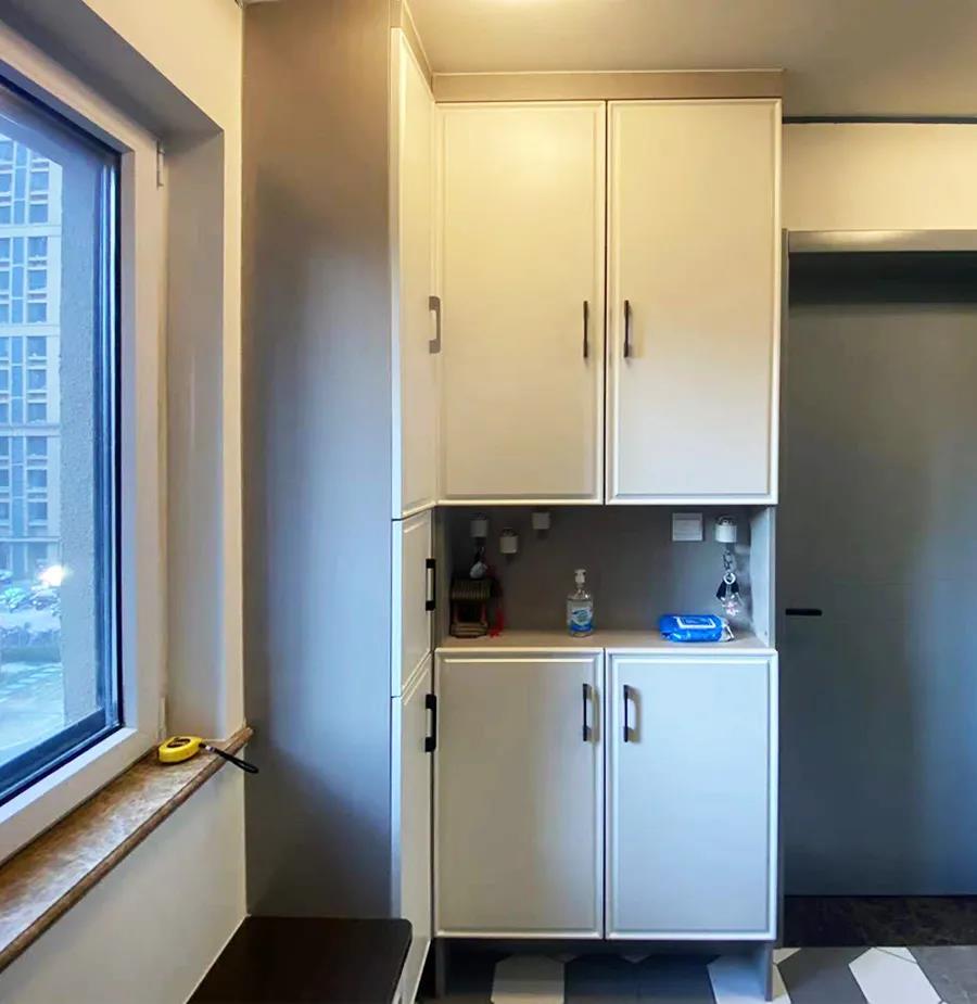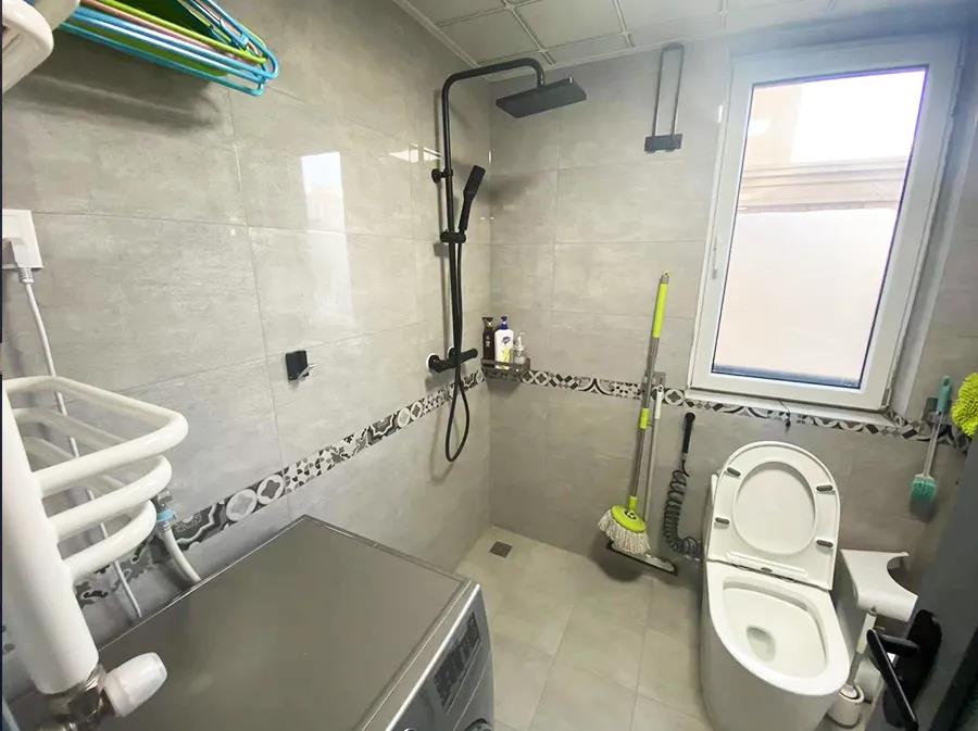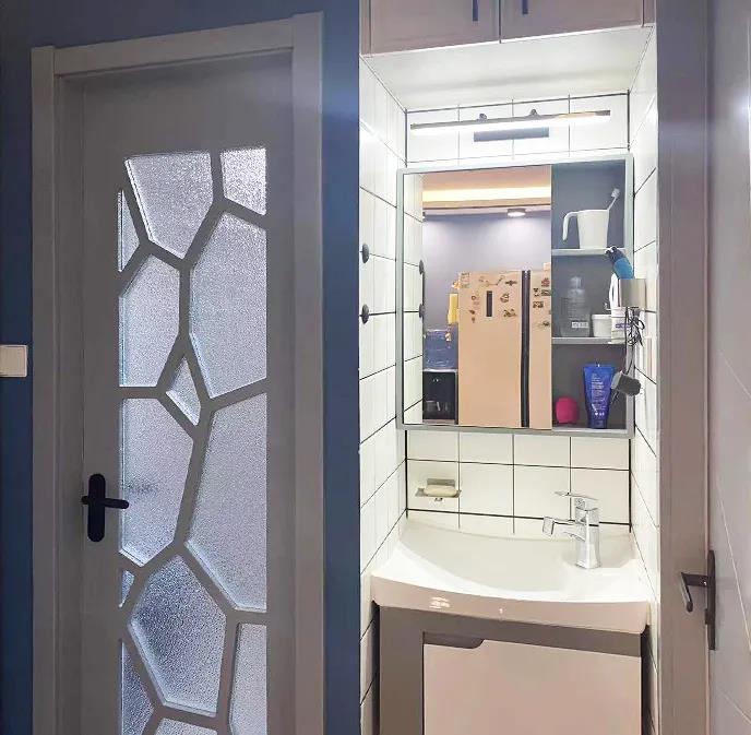 為了解決多人同時(shí)使用衛(wèi)生間的難題,設(shè)計(jì)師將衛(wèi)生間的輕體隔斷墻進(jìn)行了拆改,洗手池外移,內(nèi)部保留洗衣機(jī)、淋浴和馬桶,這樣將使用頻率最高的洗手池和馬桶分隔開來,緩解了同時(shí)使用衛(wèi)生間的壓力。