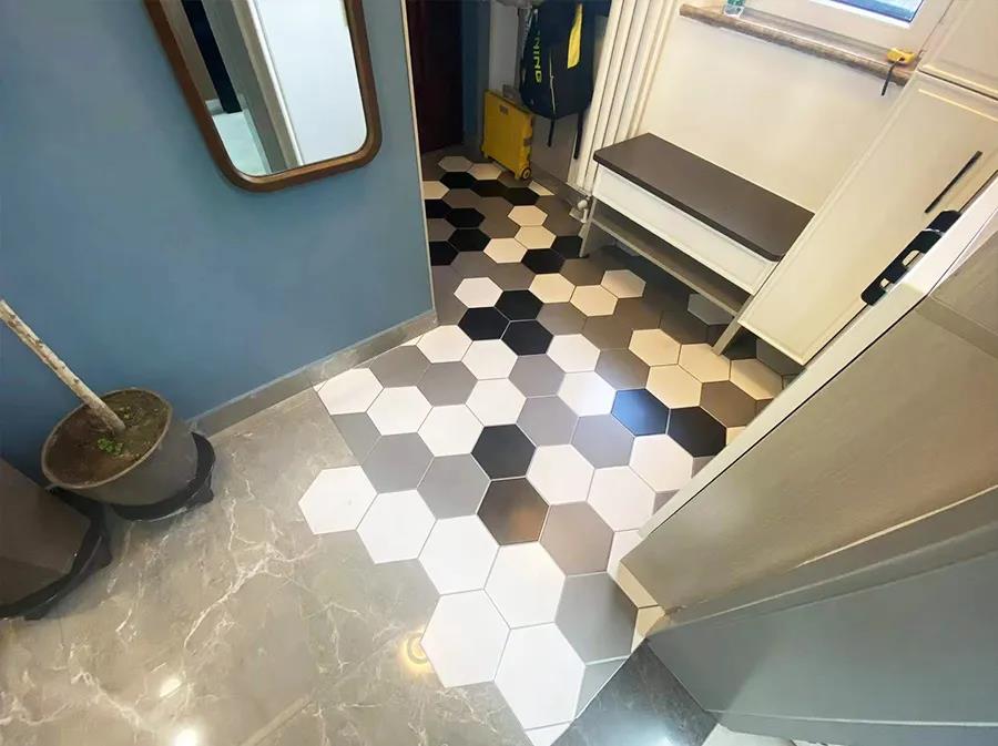 由于門廳過道較窄,只有將近1.2米的寬度,所以在過道處,設(shè)計(jì)師利用定制家具為業(yè)主定做了護(hù)墻板來掛取臨時(shí)穿放的衣物。里面一組L型定制鞋帽柜以滿足門廳的儲物需求,換鞋凳的設(shè)置方便老人和小孩平時(shí)換鞋。地面采用了富有設(shè)計(jì)感的六角磚,既豐富了門廳空間又強(qiáng)調(diào)了區(qū)域的劃分。
