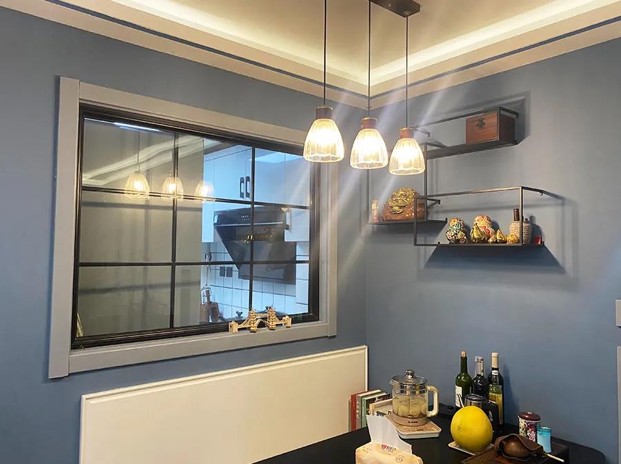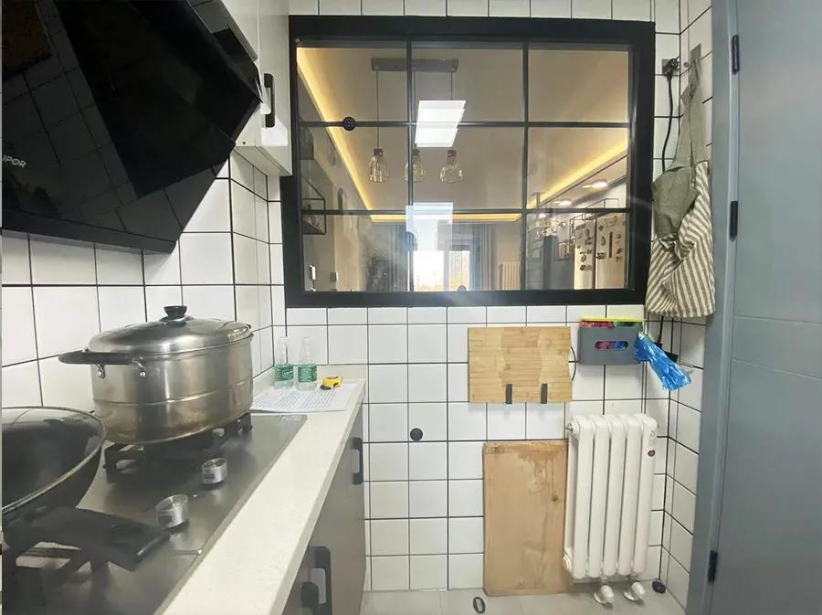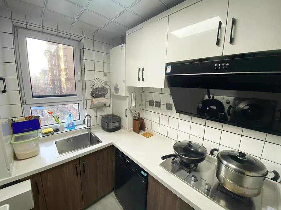 設(shè)計(jì)師重新調(diào)整了廚房內(nèi)部格局,一組L型櫥柜,提供了充分的操作和儲物空間,洗、切、炒動(dòng)線合理,方便使用。并且別出心裁的在廚房與客餐廳共用的一面墻體上開了窗戶,既增加了客餐廳區(qū)域的采光又使廚房更顯開闊通透。