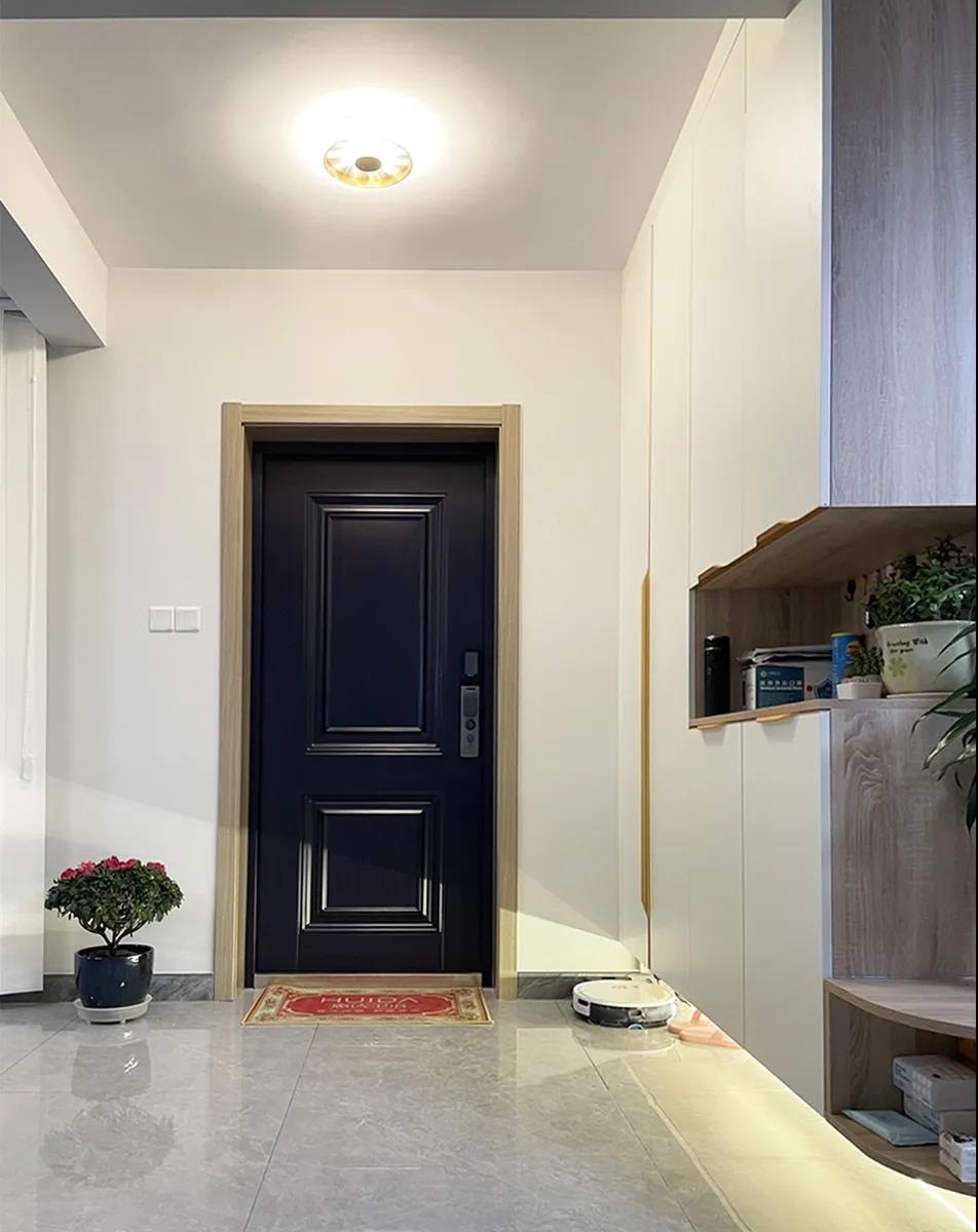 設(shè)計(jì)師拆除了門(mén)廳與客廳共用的這面墻體,使門(mén)廳得到了更多的采光,利用潤(rùn)元定制家具沿墻體打造了一組通頂鞋帽柜,規(guī)劃出了掛衣區(qū)、放鞋區(qū)以及可隨手放置小物件的區(qū)域,滿足了門(mén)廳儲(chǔ)物需求。