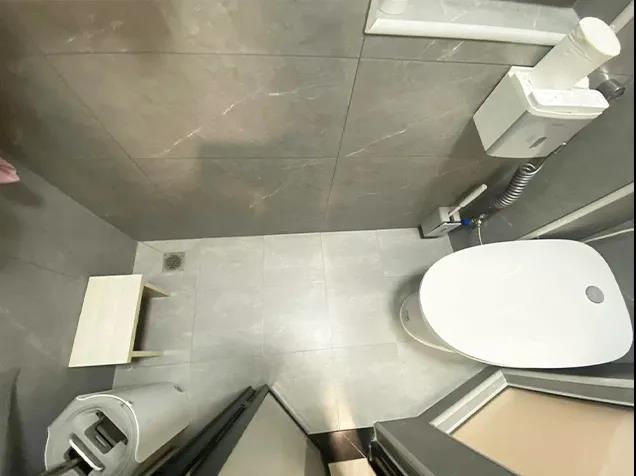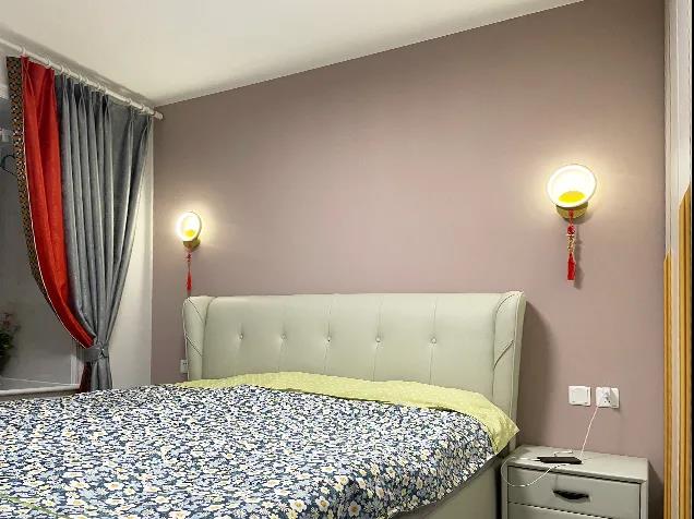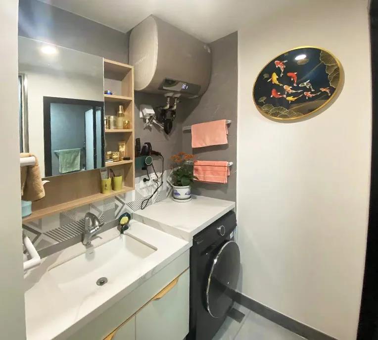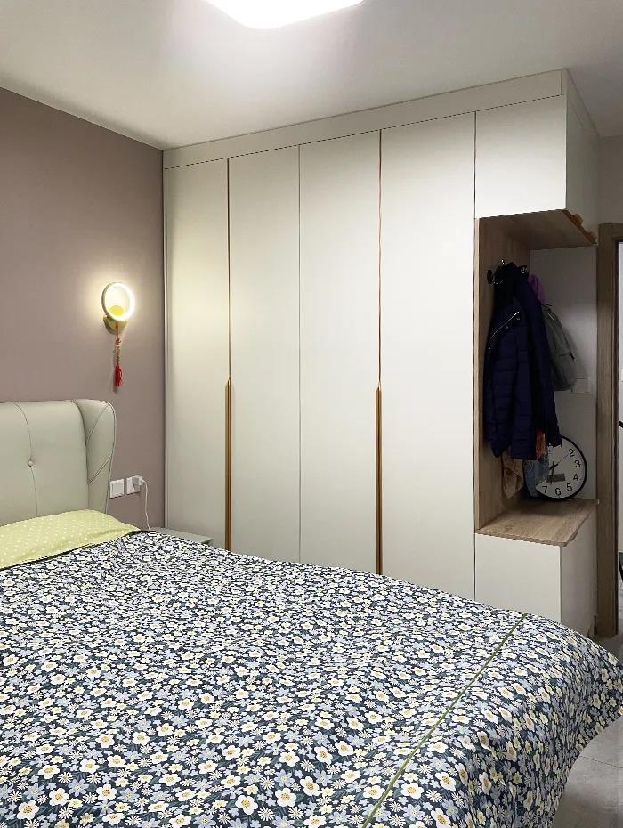 設(shè)計(jì)師將衛(wèi)生間和主臥共用的這面輕體墻向臥室挪動(dòng)了30厘米,在這里打造了衛(wèi)生間的干區(qū),洗衣機(jī)也在這里找到了合適的位置。新建一面異形墻,使馬桶和淋浴區(qū)使用起來(lái)更寬敞舒適。