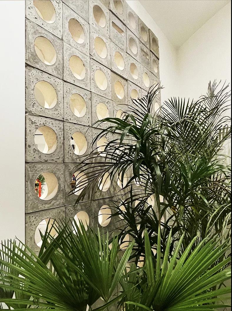 下面這里既可以是玄關(guān),也可以當(dāng)做讀書角,透過水泥磚,綠植隱約的顯現(xiàn),在這里,一本書,一杯咖啡,一個下午就可以很愜意。