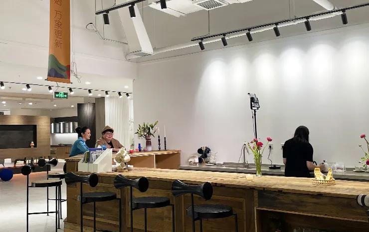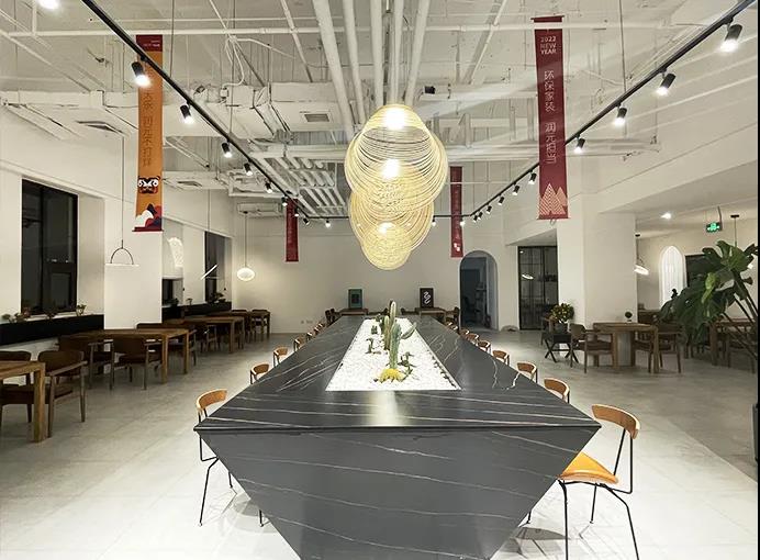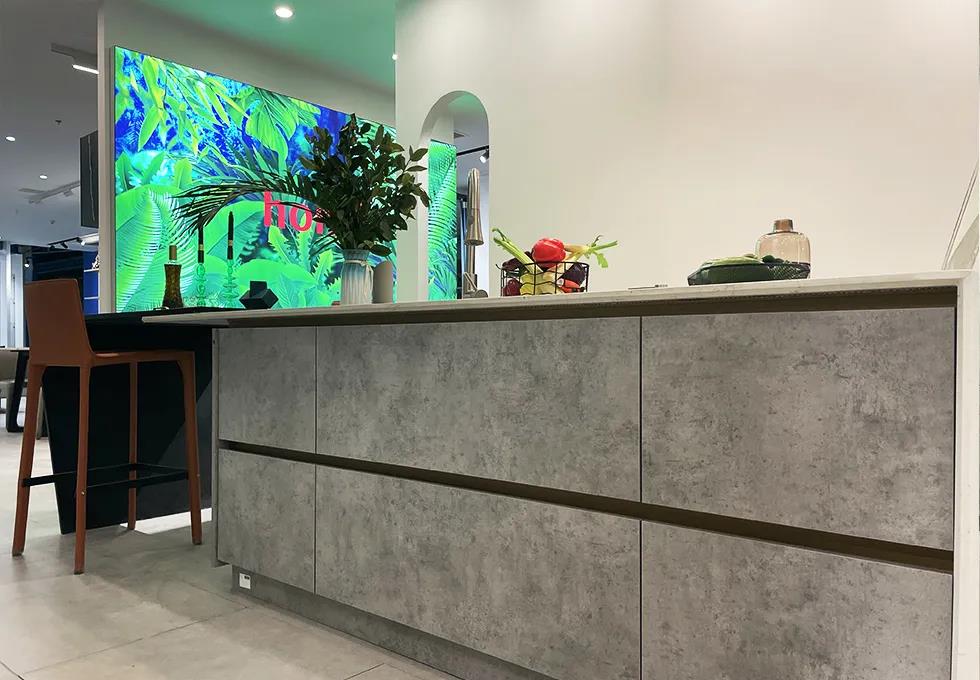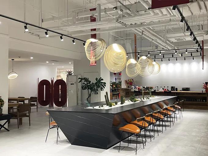 這次展館升級,以中間異形洞口為中心,劃分了三條動線,做了三個分區(qū),分別是洽談區(qū)、主材區(qū)和定制區(qū)。整個洽談區(qū)的改造,設(shè)計師以咖啡廳的整體感覺為設(shè)計來源,吧臺、回形加長導(dǎo)臺、獨立四人位桌椅,設(shè)計師在這里可以和不同家庭結(jié)構(gòu)的業(yè)主朋友們進(jìn)行輕松、愜意的交流!