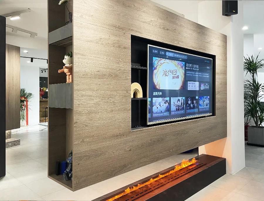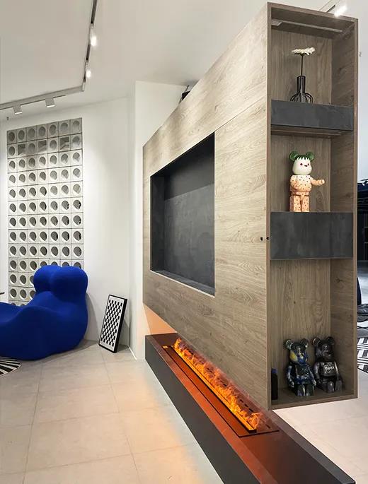 整個客廳場景里最搶眼的要數(shù)懸空的電視背景墻,這樣的設(shè)計,不僅保證格局的通透性,鏤空處增加的蒸汽壁爐,也給整個空間增添了溫暖的氣氛,搭配整體餐廳、廚房一體化的設(shè)計,特別適合小戶型的家庭來借鑒。