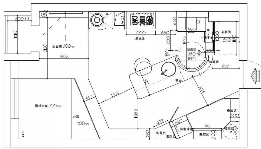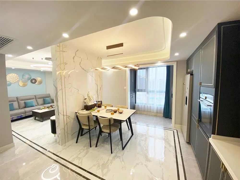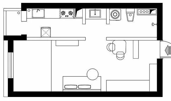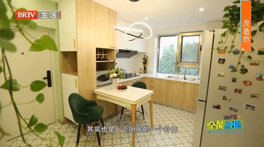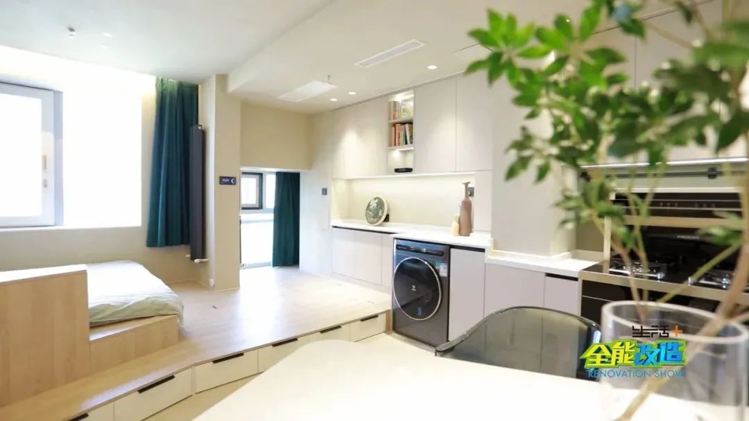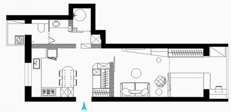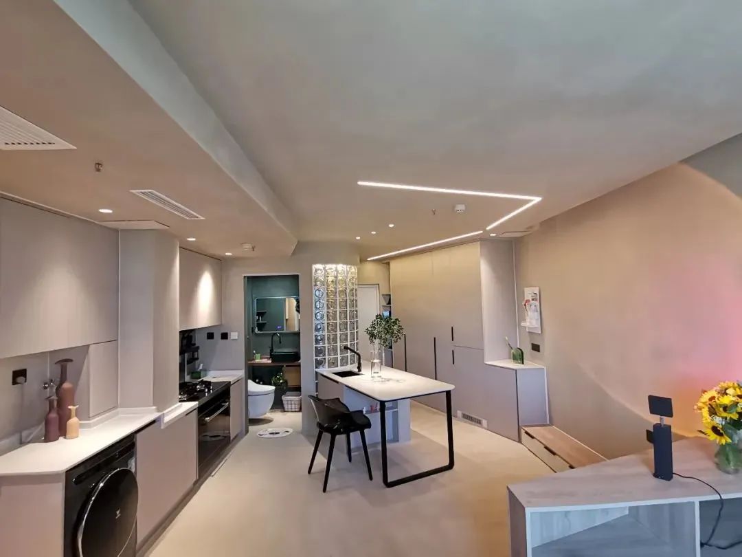 設(shè)計師賈向楠改變原有結(jié)構(gòu)和動線,重新規(guī)劃一條斜線異形布局,以島臺為中心,進行U字形設(shè)計規(guī)劃,讓小戶型各個功能區(qū)完善的同時,還可以互相借用空間,實現(xiàn)多功能區(qū)域聯(lián)動。