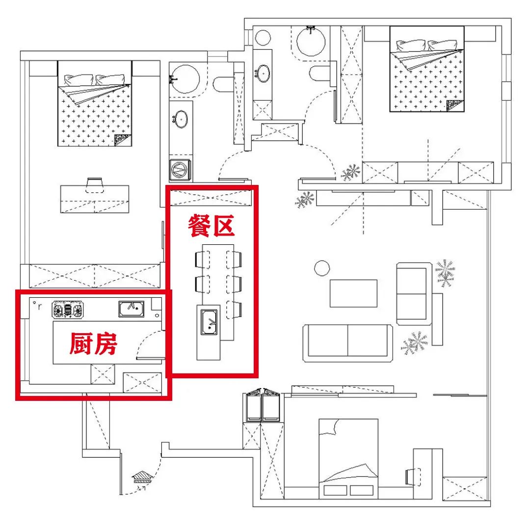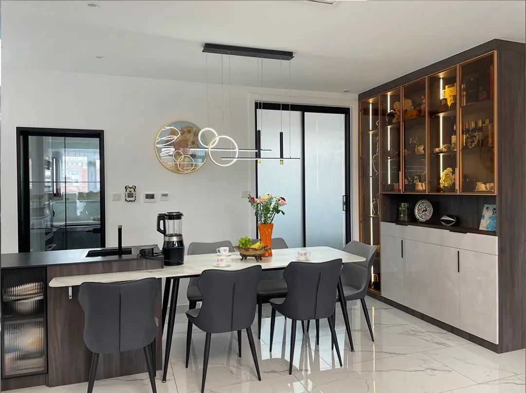 其實(shí)外部的延伸很簡單,就是把廚房的一些功能,給它延伸到餐廳,或者是客廳,但是有一個(gè)前提是客廳和餐廳必須是和廚房緊挨著的。