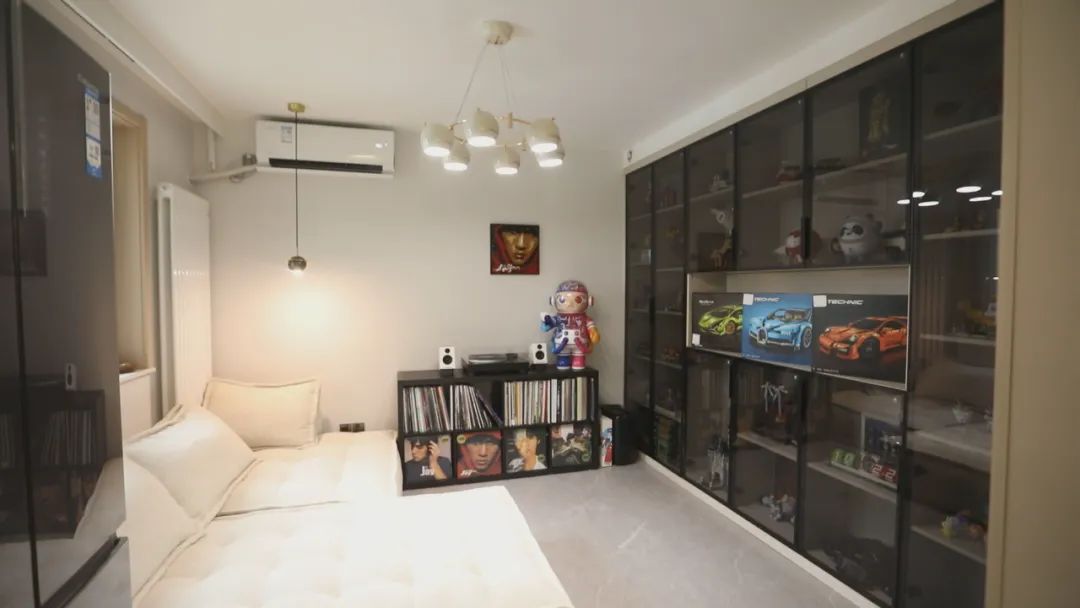 設(shè)計師結(jié)合謝先生夫妻倆的需求,客廳里放棄了傳統(tǒng)的沙發(fā)、電視、茶幾三件套,而是利用潤元的定制家具,打造了集休閑、展示、儲物為一體的放松空間。