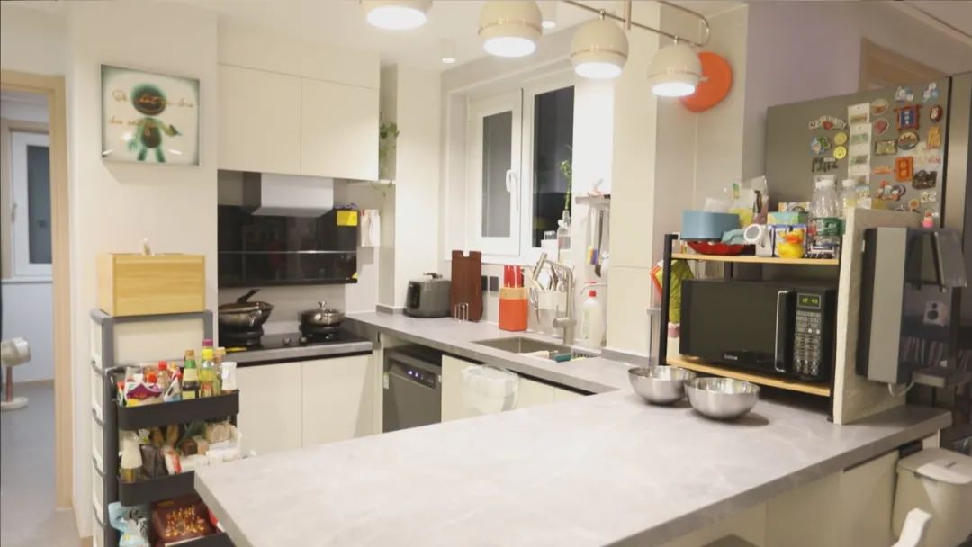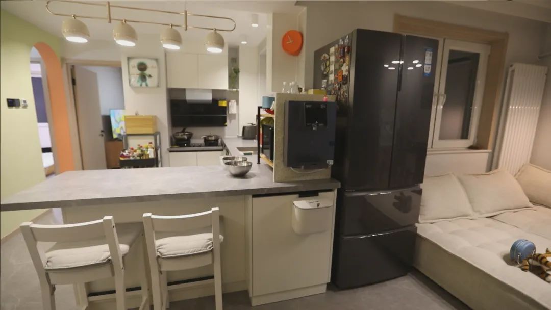 設(shè)計師拆除了廚房的部分墻體,做成開放式廚房,結(jié)合業(yè)主身高打造的不同高度的一組L型櫥柜,也方便后期使用,島臺的設(shè)計,更是便于一家人的互動溝通。廚房上的梁也被設(shè)計師巧妙隱藏進吊頂里,整個頂面更為整體美觀。