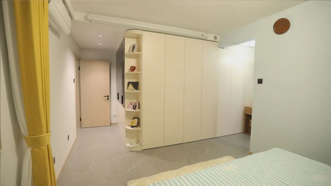 設(shè)計師把另外一套房的客餐廳空間,規(guī)劃成了謝先生夫妻的主臥,加上內(nèi)嵌一個衛(wèi)生間,形成一個套間,整體空間舒適,原本入戶門的位置,放置了梳妝臺,靠近衛(wèi)生間洗漱化妝非常方便,同時,在原本餐廳的位置,利用潤元的定制家具做了一個隱形步入式衣帽間。