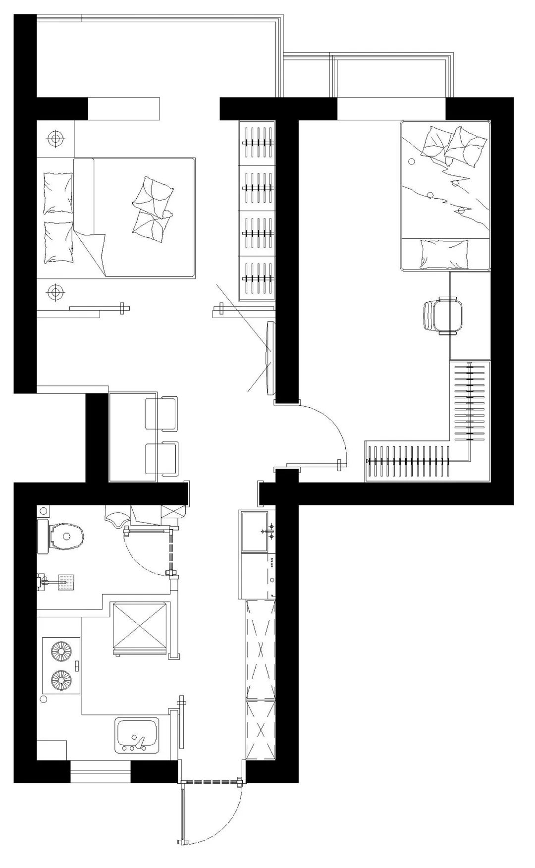 衛(wèi)生間——移動(dòng)墻體,增加衛(wèi)生間面積,將洗手盆外移,合理規(guī)劃了淋浴、坐便區(qū),實(shí)現(xiàn)了干濕分離。