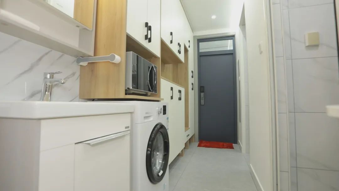 門廳—— 一組功能分區(qū)明確的定制柜,一部分作為鞋帽柜,滿足門廳收納,一部分作為電器柜,補(bǔ)充廚房?jī)?chǔ)物,同時(shí)將洗衣機(jī)內(nèi)嵌其中,節(jié)約衛(wèi)生間空間。
